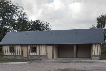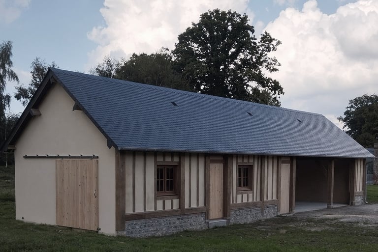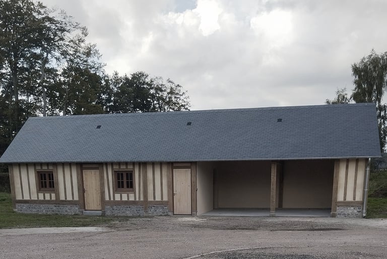 La réhabilitation d'un bâtiment annexe en pans de bois complète l'intervention, accueillant des fonctions techniques et un espaces accessible au public, participant à la valorisation du patrimoine local et à la requalification du coeur de village.
